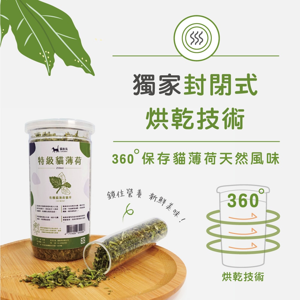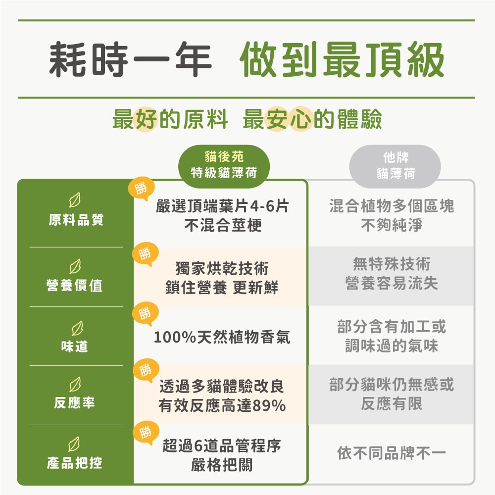 - 獨家烘乾技術: 採用封閉式烘乾技術,能夠最大限度地鎖住營養成分,保持貓薄荷的新鮮度和效用。